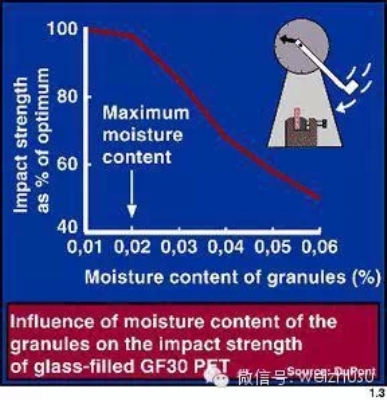 另一方面,PET和PBT对水分非常敏感,一定要干燥以确保制品的冲击强度不受影响。另外,这些树脂在干燥后很快会再次吸水,因而,在一些情况下加工厂商必须特别小心,在PBT和PET树脂在运输和传送过程中,避免使用敞开的容器同时也应考虑树脂在装料斗中的停留时间。