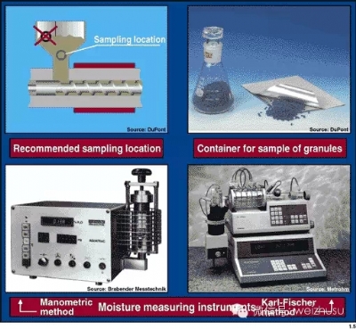 塑料颗粒中的水分可用一些测量仪器进行测量,如压力计或使用卡尔-费歇尔方法的仪器。为了消除测量误差,样品应从进料斗的下部选取,并在适宜的容器中密封保存。
