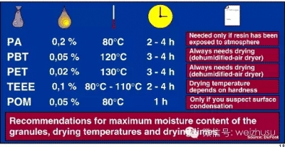 另一方面,PET和PBT对水分非常敏感,一定要干燥以确保制品的冲击强度不受影响。另外,这些树脂在干燥后很快会再次吸水,因而,在一些情况下加工厂商必须特别小心,在PBT和PET树脂在运输和传送过程中,避免使用敞开的容器同时也应考虑树脂在装料斗中的停留时间。